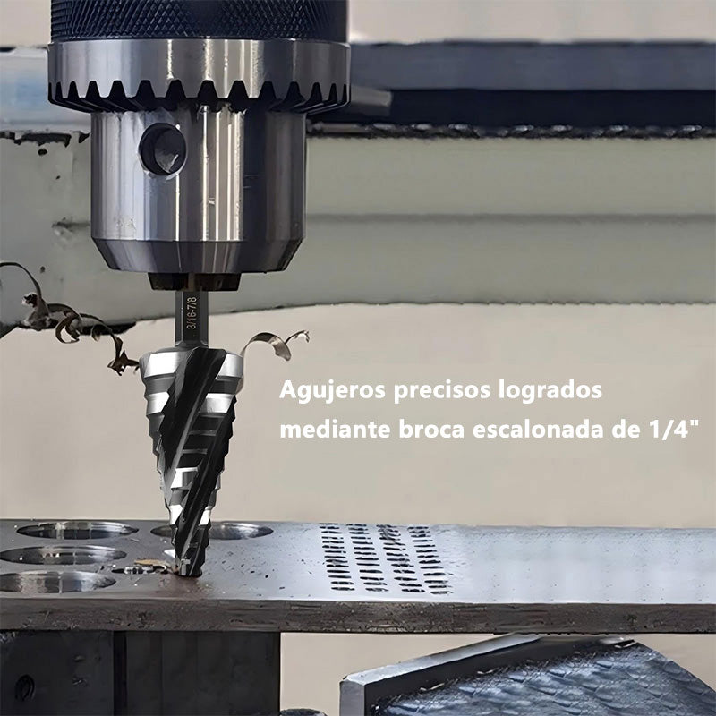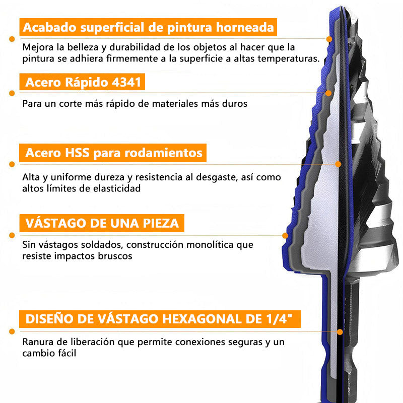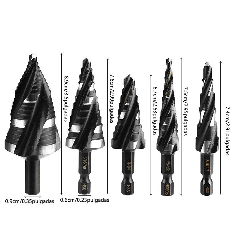 El paquete incluye: 1 juego de brocas escalonadas HSS de 5 piezas para metal.