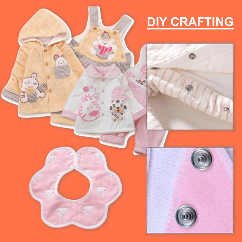 Este kit de herramientas de botones a presión es suficiente para satisfacer sus diferentes necesidades en manualidades de bricolaje o confección de ropa fina. Se puede aplicar a baberos de bebé, ropa de gateo, gorros, camisetas, monos de bebé, toallas de saliva, ropa de barbie/muñeca, ropa de mascotas u otros lugares donde lo necesites.