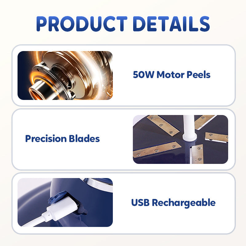 CUCHILLAS INTELIGENTES, CERO DESPERDICIOS: cinco cuchillas ultradelgadas de acero inoxidable se deslizan por la piel sin dañar la fruta, por lo que cada manzana, melocotón o pera se mantiene jugosa y sabrosa. Incluso las delicadas uvas quedan impecables, sin desperdiciar pulpa, solo pura delicia lista para comer.