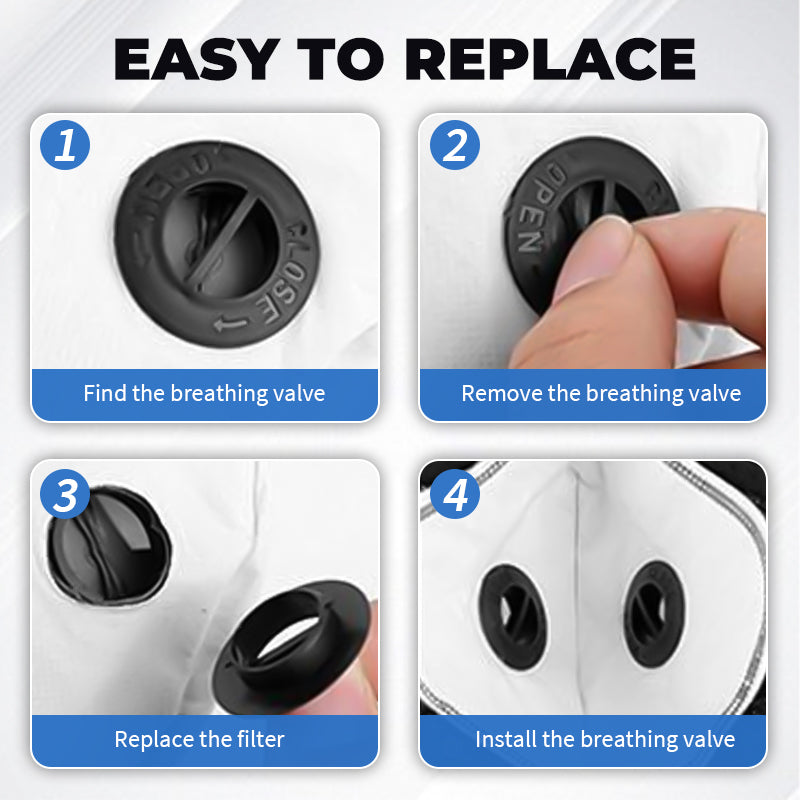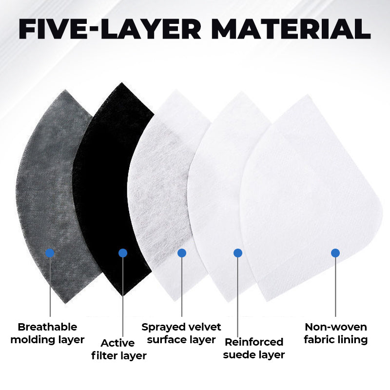 SISTEMA DE FILTRACIÓN AVANZADO : cuenta con un diseño de filtración de cinco capas con carbón activado y capas de algodón multicapa para bloquear el polvo, los contaminantes y las micropartículas al tiempo que garantiza una comodidad transpirable.